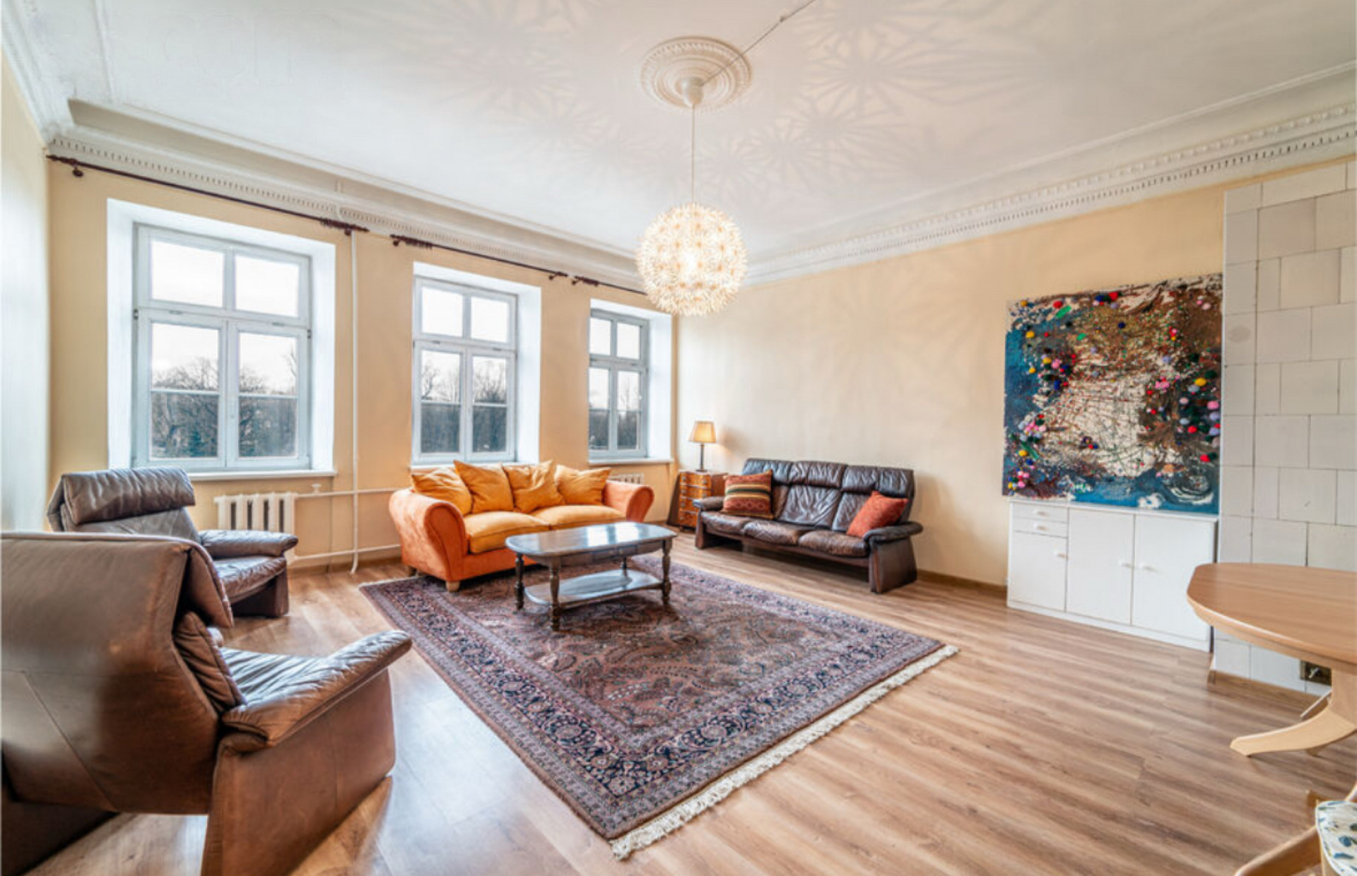 A furnished 4-room apartment with all necessary household appliances is available for rent in the center of Riga, at Merkela Street 17/19. The apartment is located on the 3rd floor and has a balcony overlooking Vērmanes Garden. Closed, renovated entrance (no elevator).