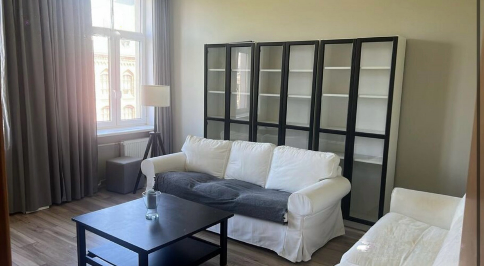 A two-room apartment is available for long-term rent in the very center of Riga — on Kalpaka Boulevard, with a beautiful view of the Art Academy.