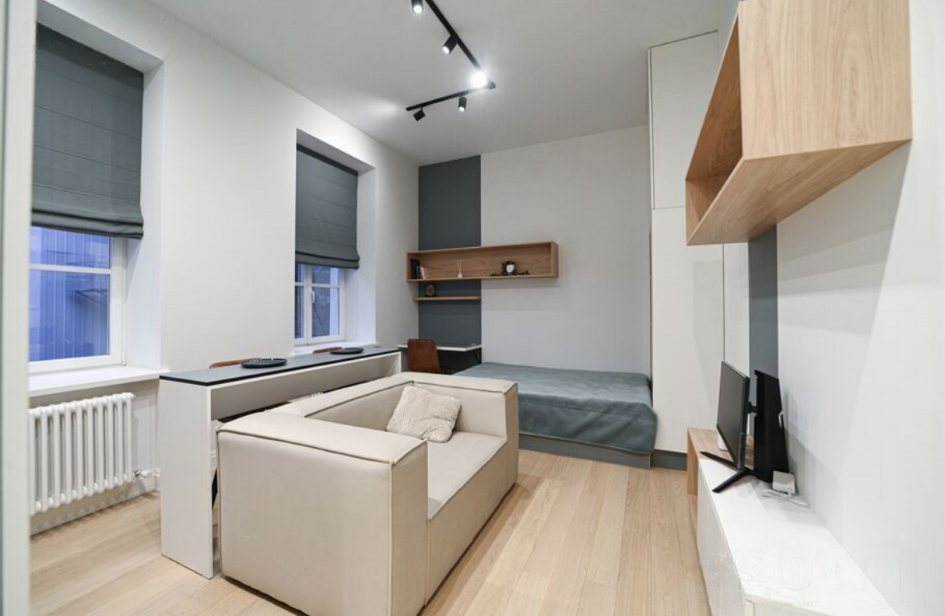 A brand-new studio apartment with high-quality finishes, fully furnished, and equipped with household appliances. Layout: hallway, bathroom combined with a toilet, living room combined with the kitchen area.