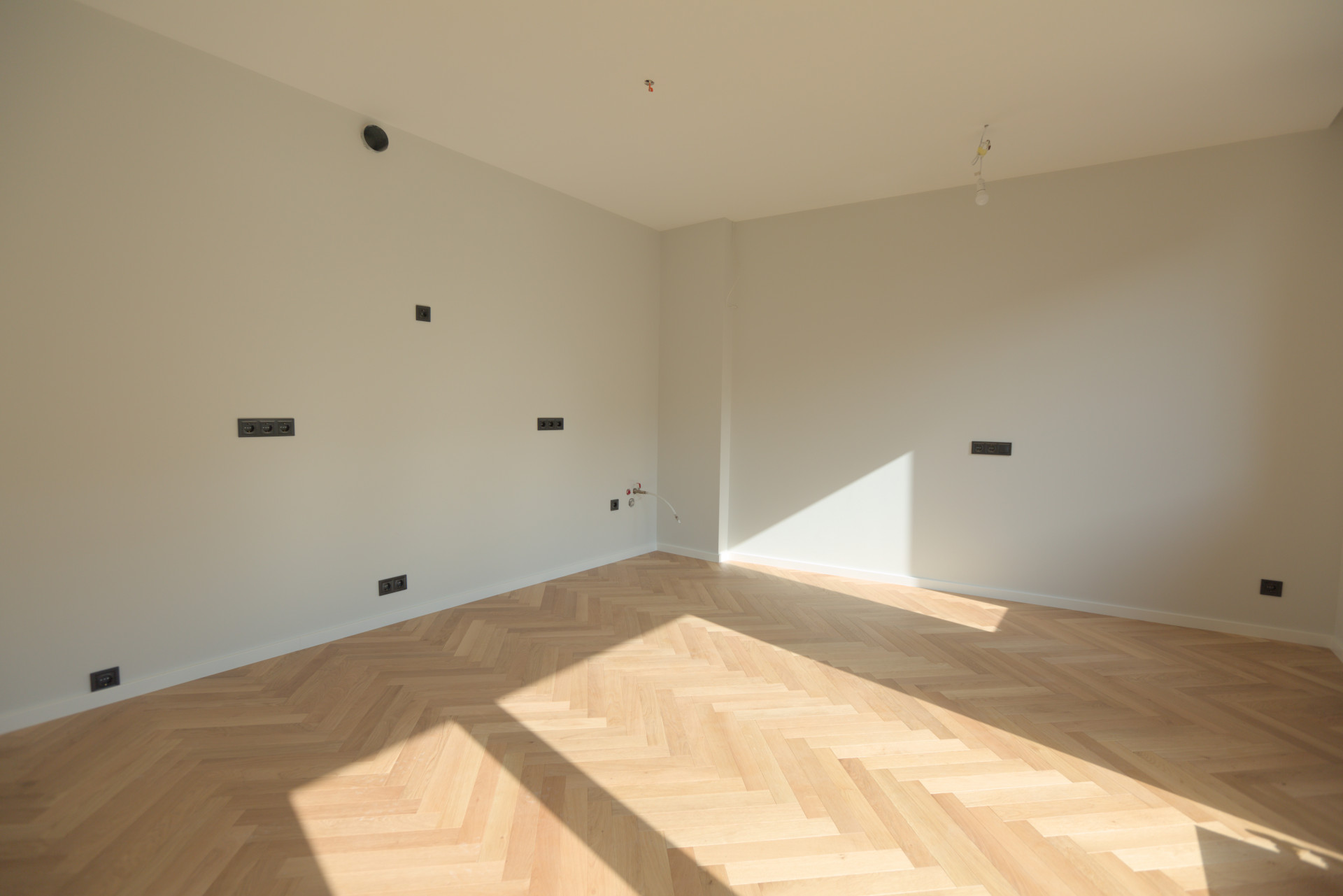 This apartment features high-quality finishes including real oak parquet in a classic herringbone pattern, high ceilings, and large windows that fill the space with natural light.
