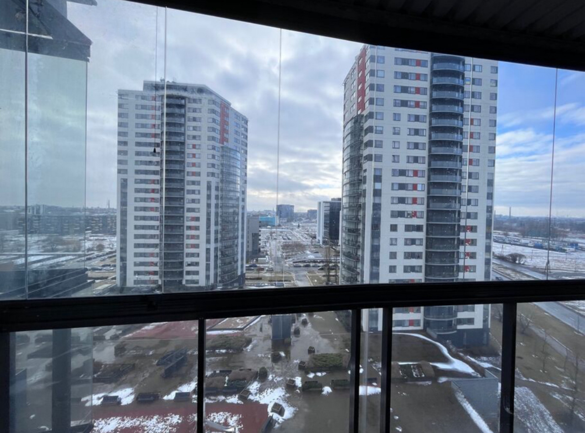 The apartment features a spacious, bright living room combined with a kitchen, a bedroom with a walk-in wardrobe, and a bathroom. The hallway has a large built-in wardrobe. A large glazed terrace offers a stunning panoramic view of Riga.