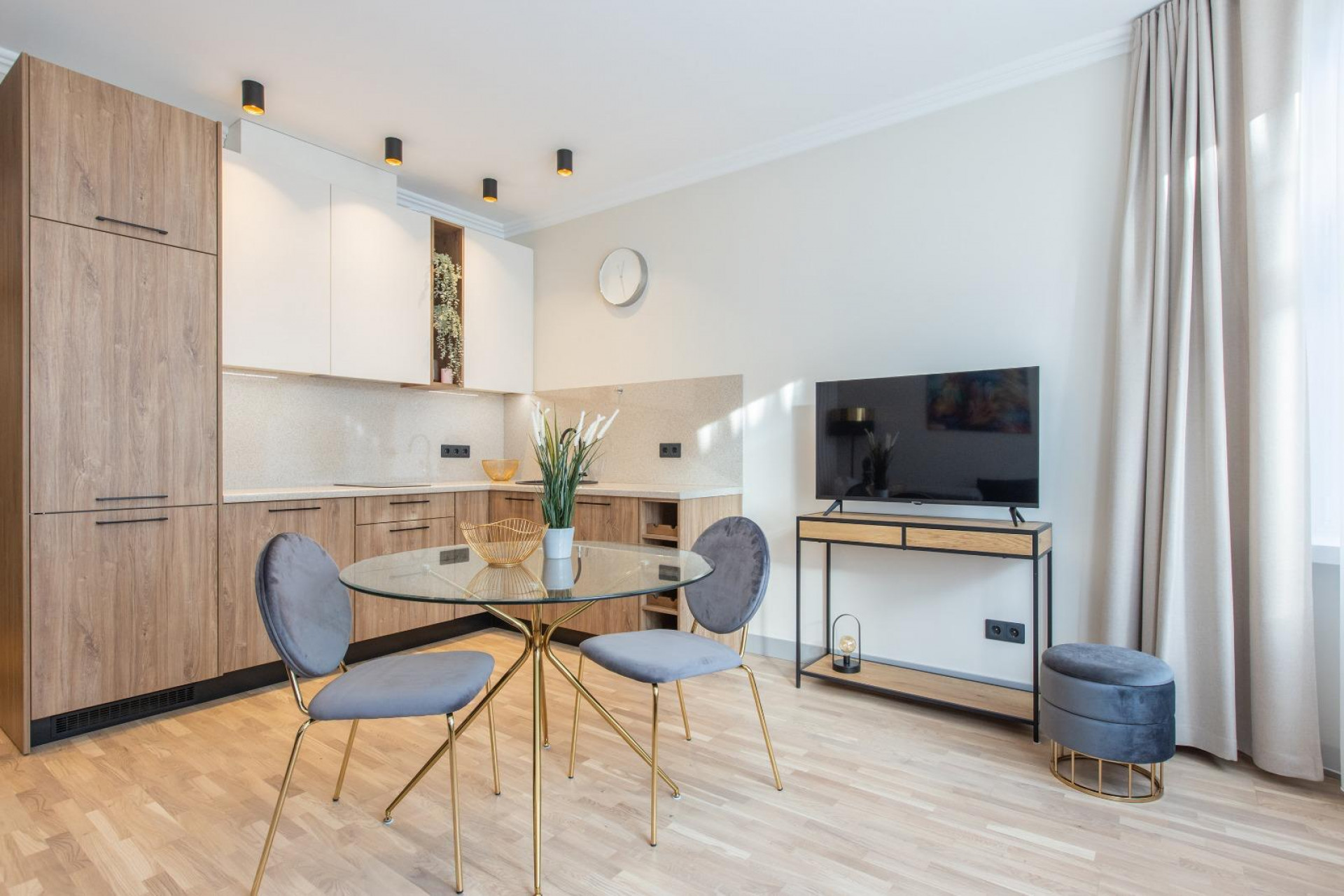 • Every detail of the space has been carefully planned: a functional living area with a comfortable sofa and coffee table, and a modern kitchen equipped with appliances.