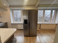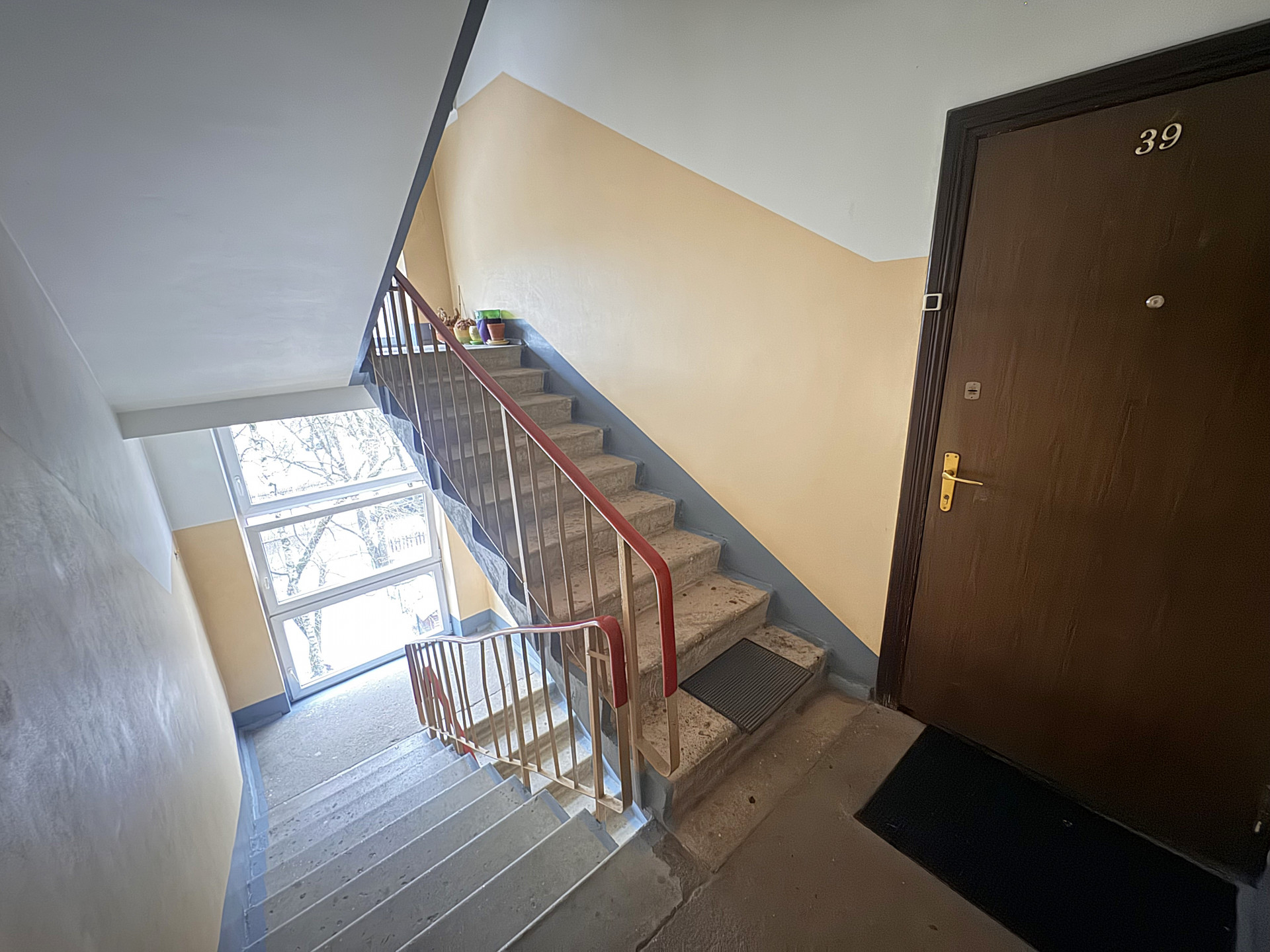* The staircase is clean and renovated, with PVC windows and a metal entrance door with a code lock.