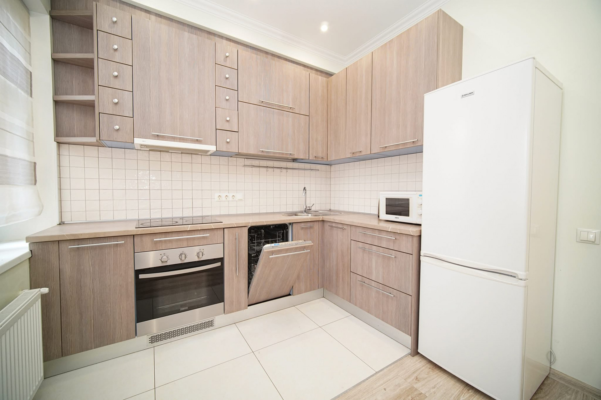 Convenient location — close to public transport stops, 15 minutes on foot to the Old Town, 20 minutes by car to Riga Airport. Nearby are a doctoral institute, schools, kindergartens, a cinema, and the Stockmann shopping center.