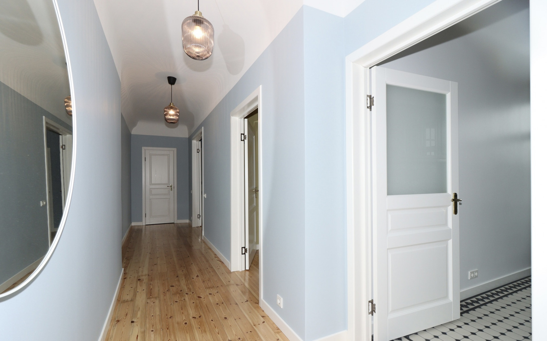 The entrance leads to a long hallway that connects all the rooms. First on the left is the kitchen. Further down the corridor is the entrance to the first isolated room. The next room is walk-through, and it leads to a second isolated bedroom. At the very end of the hallway, there is a bathroom with WC.