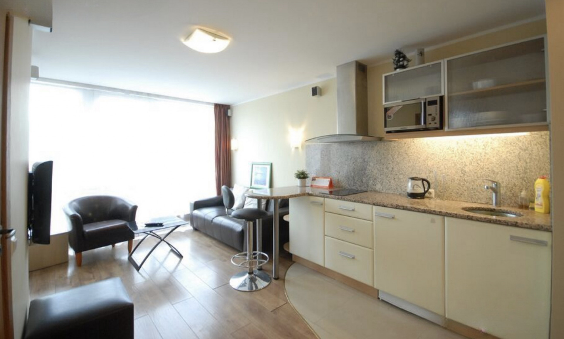 The apartment has recently undergone a high-quality renovation with original designer solutions, including granite and marble surfaces, tiles, and Villeroy & Boch sanitary ware.