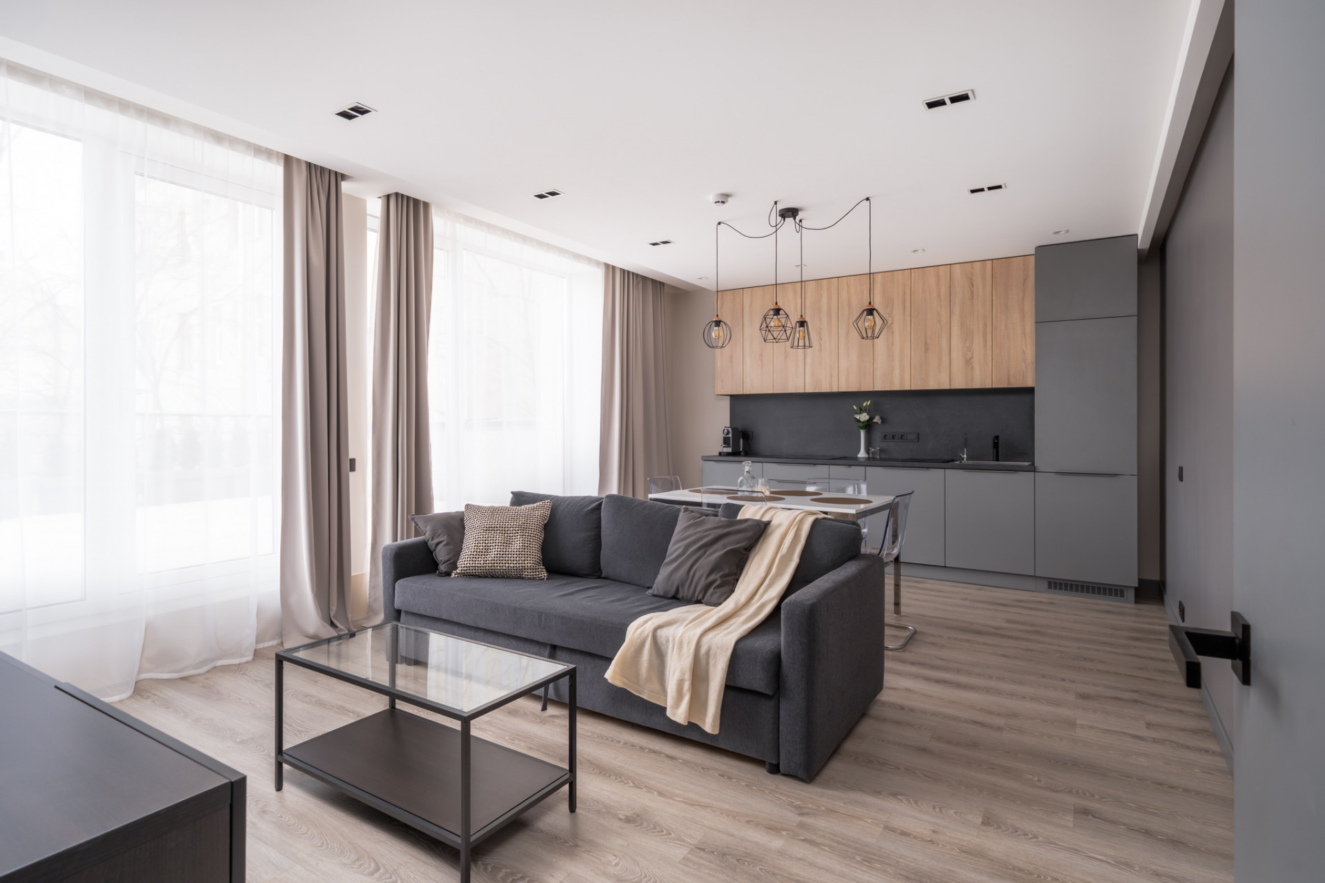 - The kitchen is fully furnished and equipped with all necessary appliances: refrigerator, hob, extractor hood, oven, dishwasher.