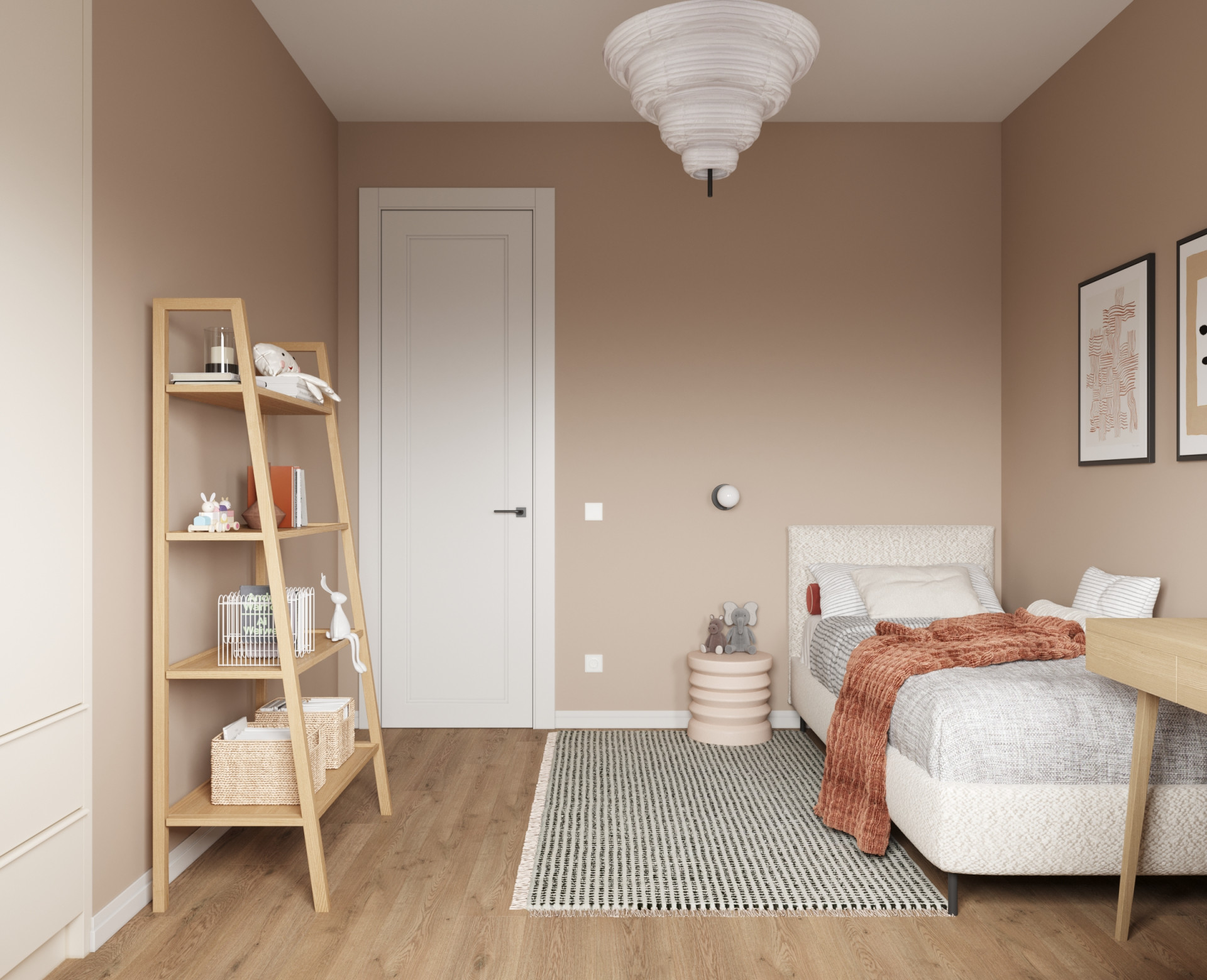 Pirmajā stāvā atrodas vannas istaba, plaša priekštelpa, palīgtelpa, virtuve apvienota ar viesistabu un izeja uz privātu terasi. Otrajā stāvā ir trīs guļamistabas, vannas istaba. Dzīvokļa kopējā platība ir 116,34 m2, tai skaitā terases platība 14,04 m2. Interjerā dominē gaiši un dabiski toņi, kurus papildina gaiši brūnas dabīgā ozola grīdas. Izstrādātāja mērķis bija radīt plašuma un gaismas sajūtu, kas tika sasniegts, pateicoties lielajiem logiem un griestiem 2,8 m augstumā, durvīm 2,4 m augstumā.