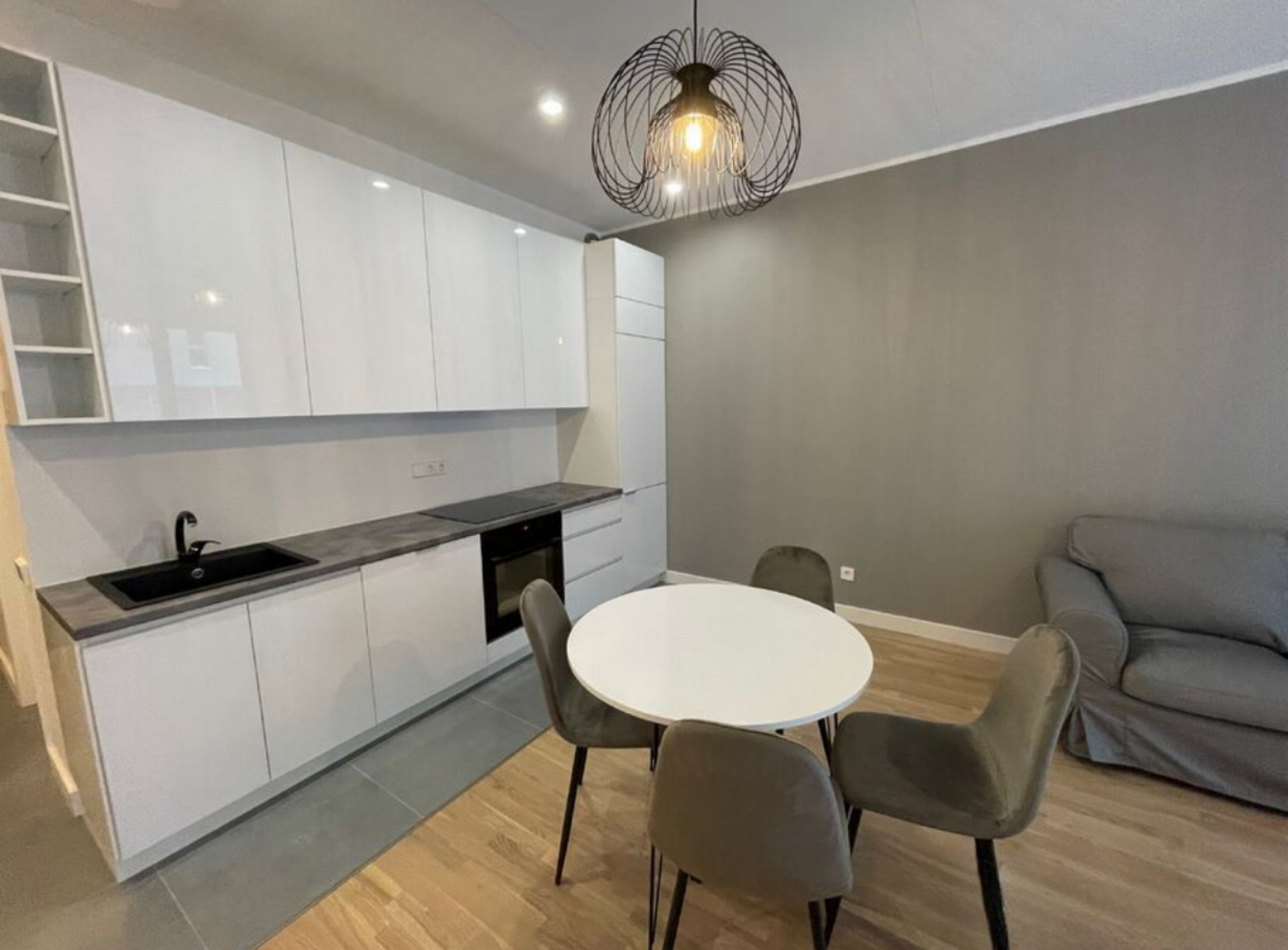 Dzīvokļa iekšējā platība ietver plašu viesistabu, kas apvienota ar virtuves zonu, atsevišķu guļamistabu un mūsdienīgu vannas istabu. Interjers ir veidots gaišos toņos, kas vizuāli paplašina telpu un rada mājīguma sajūtu.
