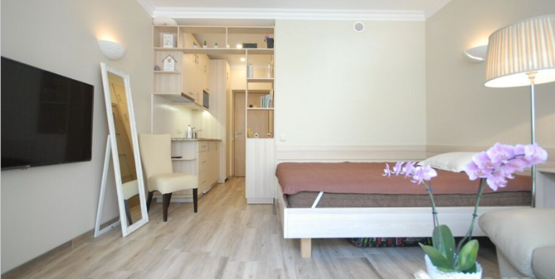 Ekskluzīvs, mājīgs dzīvoklis ar terasi-mini dārzu, pilnībā aprīkots kā ekskluzīvs 5 zvaigžņu viesnīcas numurs. Interjerā izmantotas granīta virsmas, grīdas un flīzes, Villeroy & Boch santehnika, LED ekrāns, akustiskā sistēma, ādas mēbeles un daudz kas cits. Ļoti skaists un moderns vestibils. Ēku kompleksā ir kafejnīca.
